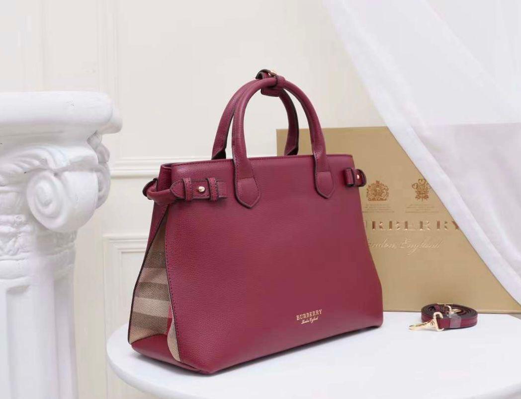 • Materials: The main body of the bag is crafted from a grainy, textured leather. The side panels are made from the brand’s iconic House Check canvas, a signature design element.